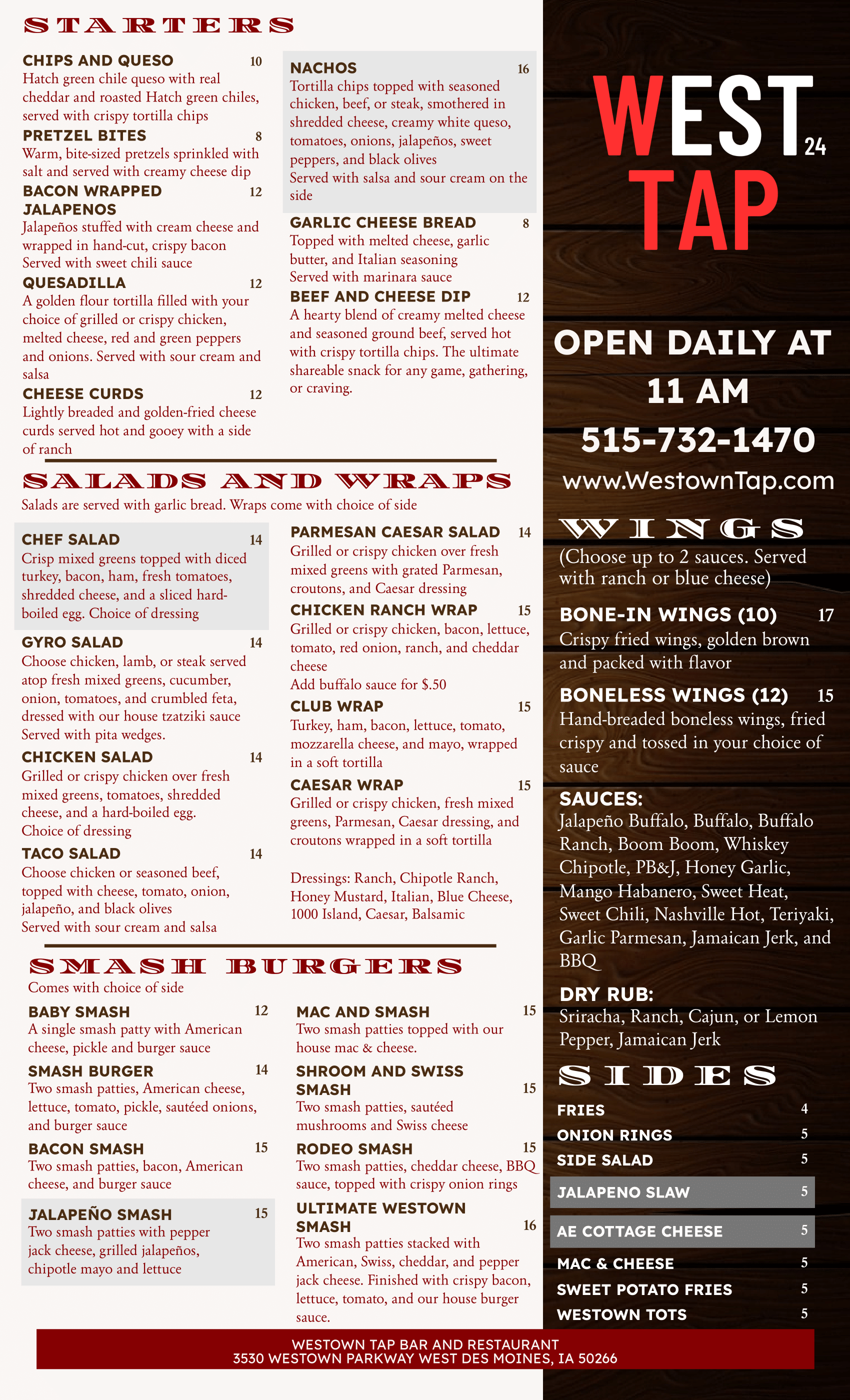Westown Tap Menu: Smash Burgers, Wings, Flatbreads, Salads & More